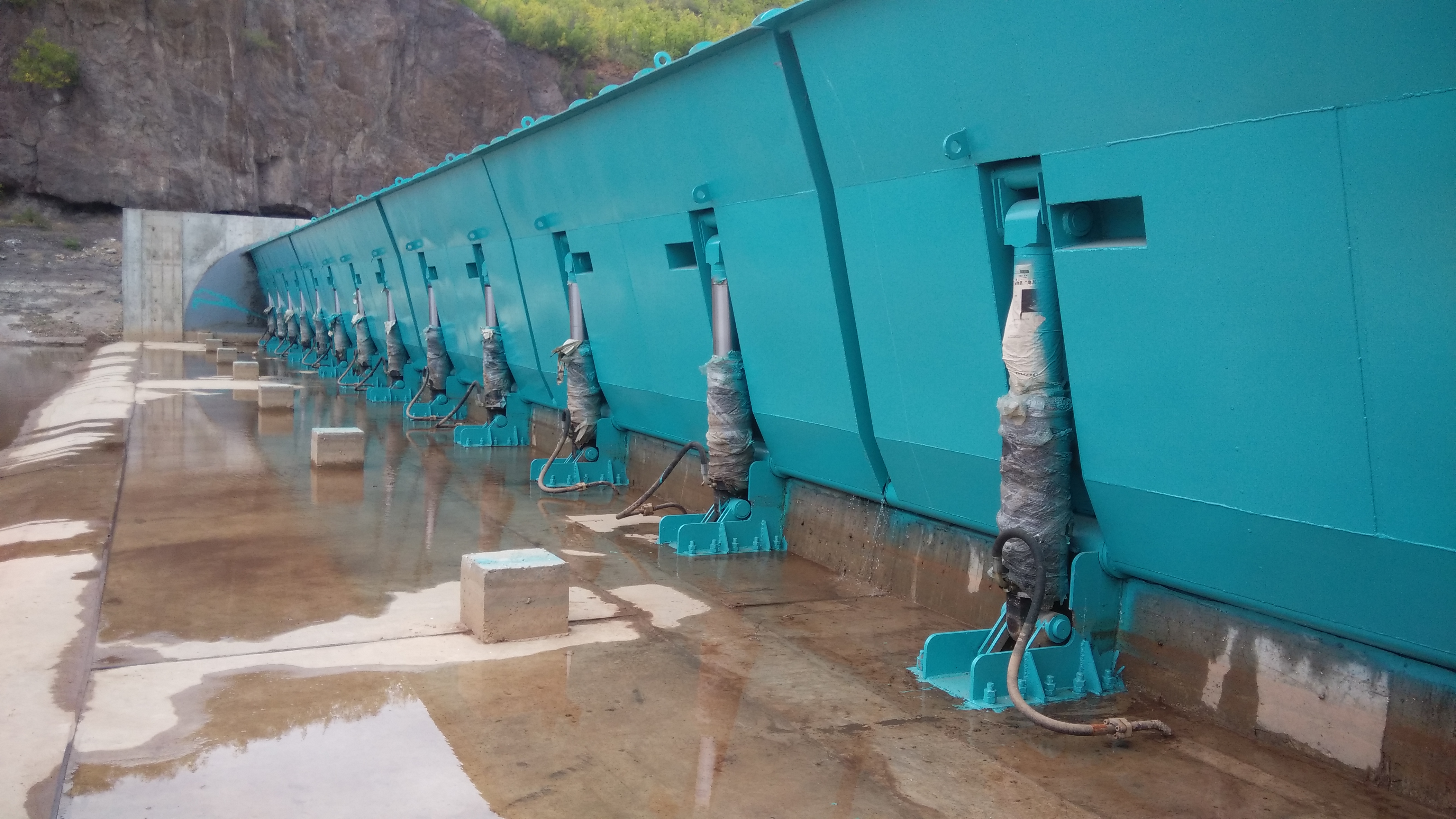 工程介紹:該工程包括42米長、2.5米高的合頁閘及一扇6米長3米高的液壓翻板閘,主要用于景觀蓄水、漂流,并保留當地特有物種中華龜的生態遷移通道。